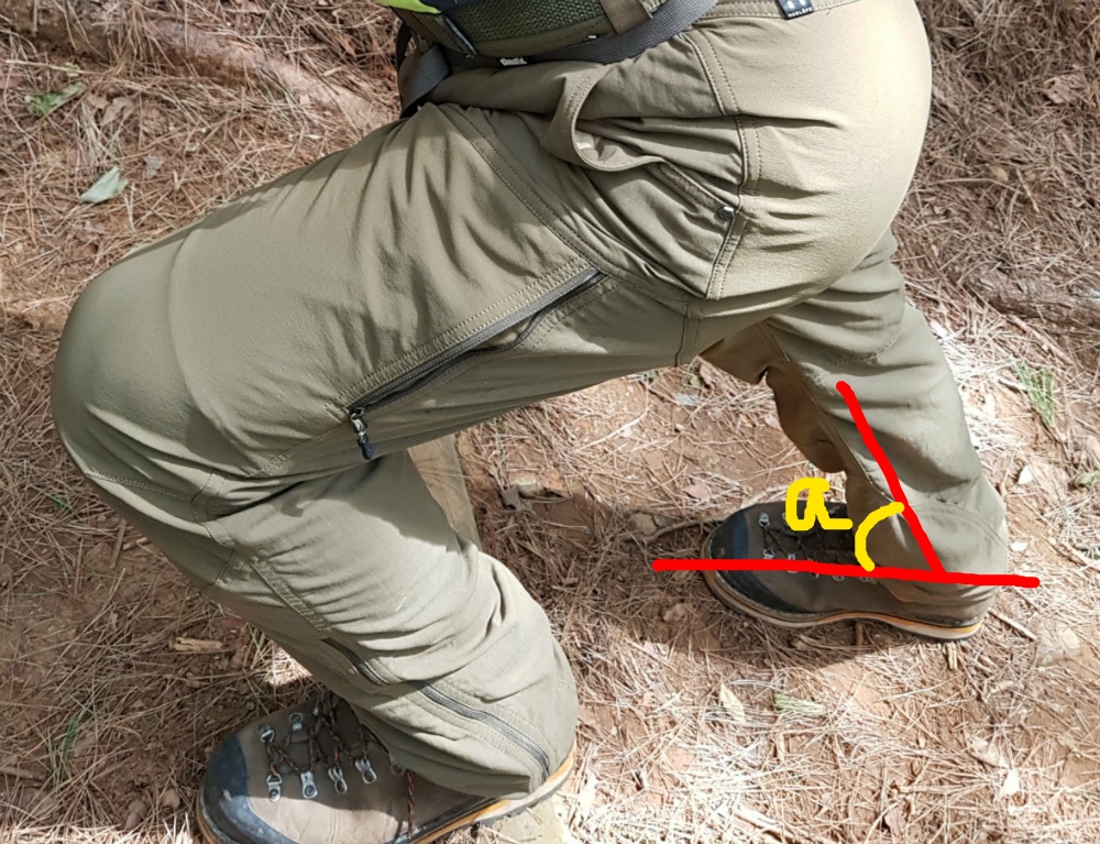 경사진 비탈을 오르기 위해서 발목이 앞쪽으로 꺽이게 되는데 이 때 경사가 심할 수록 많이 꺽이게(사진의 a각도) 되며 아킬레스건, 비복근 등에 스트레스도 심하게 가해집니다. 또한 발목이 앞쪽으로 꺽이는 과정에서 등산화 목이 방해를 하게 되면 안써도 될 힘을 쓰게 되니 발목이 적당하게 움직일 정도로 등산화 끈을 묶게 되면 힘의 낭비를 줄일 수 있습니다.
