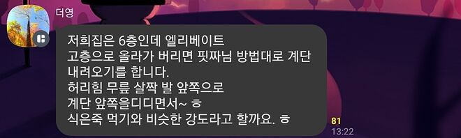 계단을 내려갈 때는 항상 허리 힘, 무릎 살짝 굽히고, 앞꿈치로 폴짝폴짝이 기본입니다.