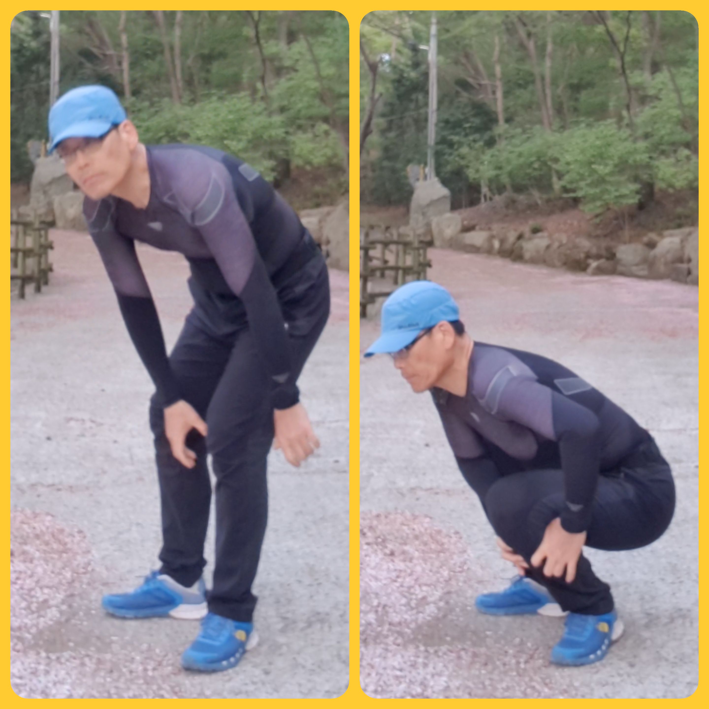 상기 이미지의 동작은 양쪽 엄지 손가락을 통증이 오는 무릎 바깥 쪽에 넣고 주저 앉는 핏짜레칭쓰리를 응용한 동작입니다.