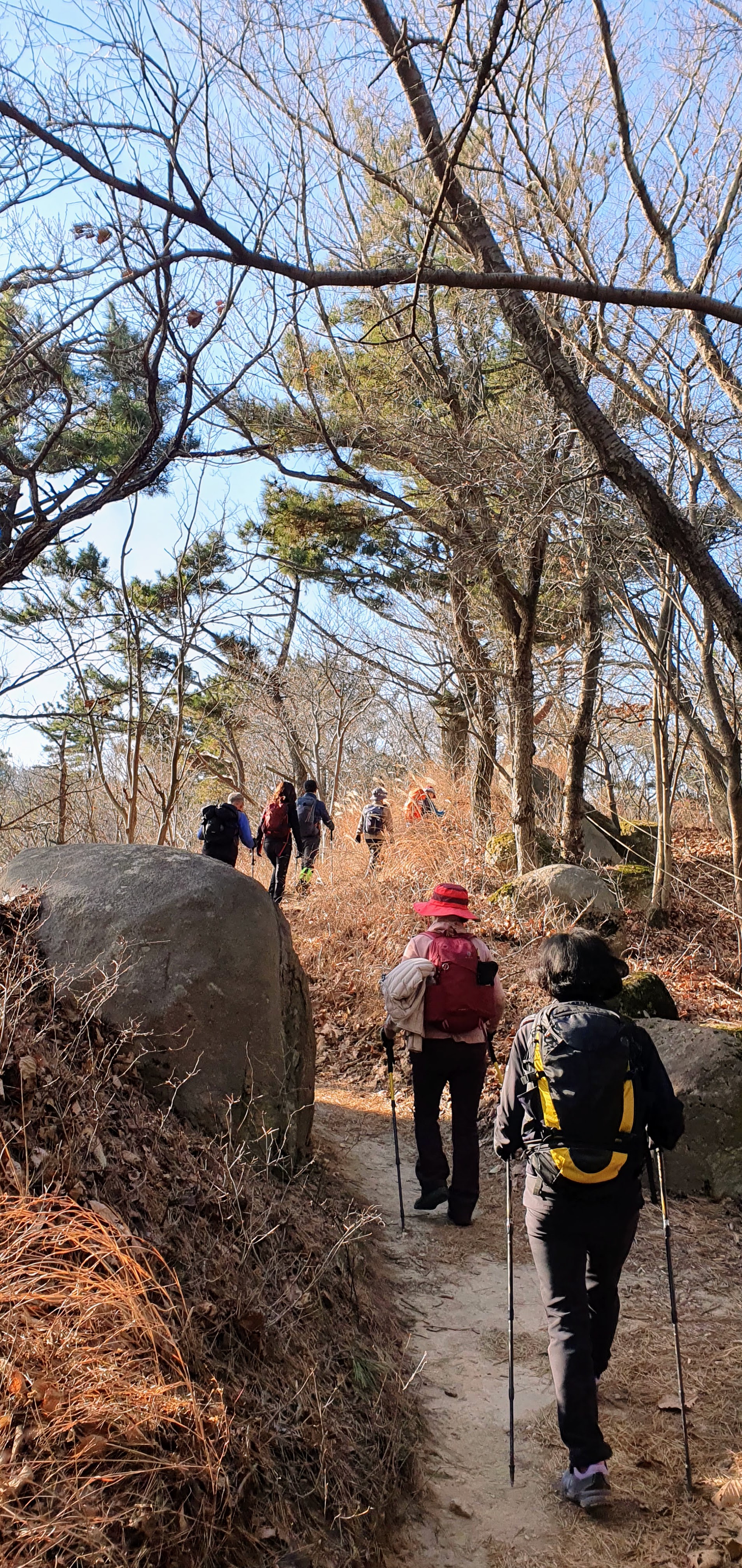 산행 종료 후 식사 자리에서 많은 이야기를 나누었습니다만 한 가지만 또 당부해 드리자면 발이 땅에 닿을 때 무릎이 펴지지 않게, 적당히 구부려진채로 디디는 것의 중요성을 말씀드렸습니다. 그리고 그러기 위해서는 무릎을 조금 높게 들면 자연스럽게 적당히 구부려진채로 디뎌진다는 것을 잘 기억하시고 잘 되지 않더라도 항상 생각하며 노력해보세요.